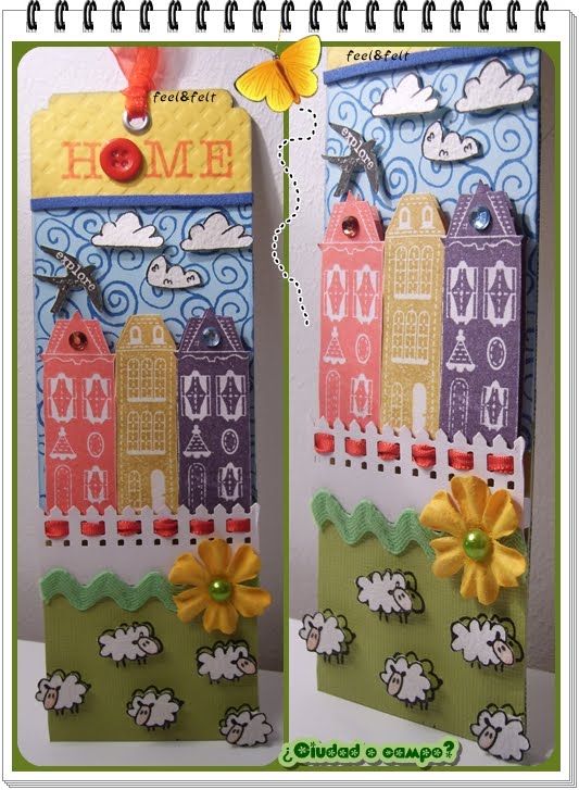 Como siempre soy una desconsiderada y nunca os comento que son sellos y que no, deciros que sellos serían: la palabra Home, las casas, las ovejitas, el pajaro, las nubes y el fondo en espiral del cielo.