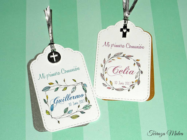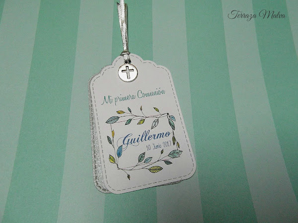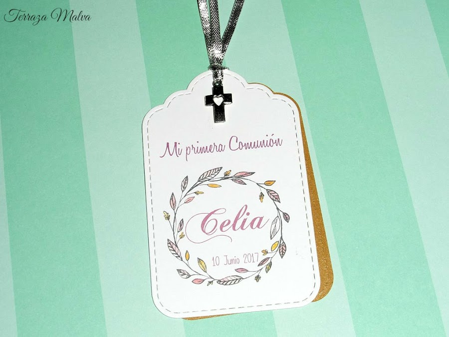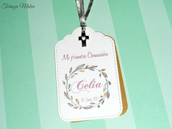 En el de Celia he usado un charm con forma de cruz y he añadido una cartulina brillante en tono dorado.