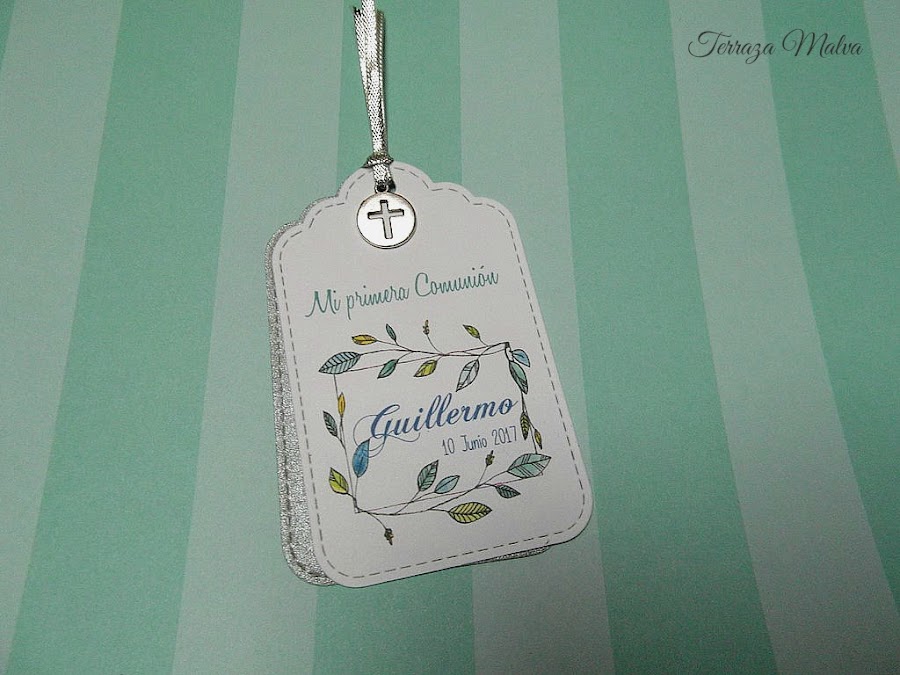 En el de Guillermo el charm es una medallita redonda con una cruz hueca. En este utilicé de trasera una cartulina brillante en tono plateado.
