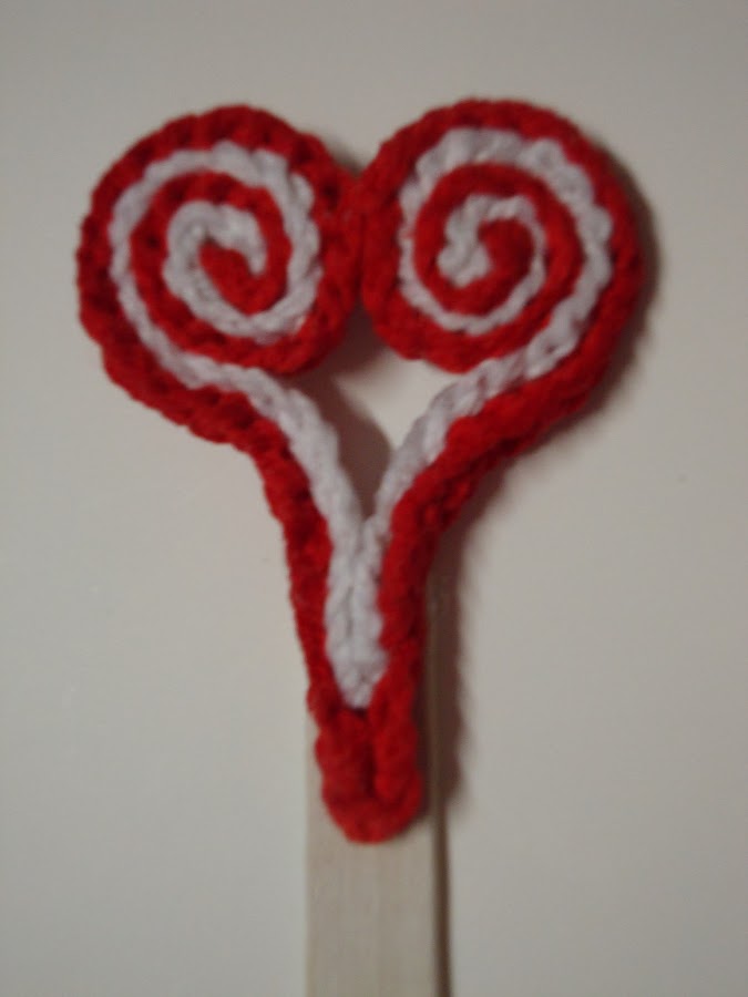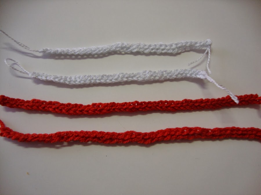 Para confeccionarlo tejí 4 tiras de cadeneta doble (el tutorial podéis verlo haciendo CLICK AQUÍ), 2 en rojo y 2 en blanco. Las rojas un poco más largas porque al ir por fuera para enrollarlas se consumen más (no importa que sobren, al final le deshacemos un poco y listo).