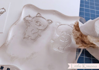 4. Limpiamos el sello con una toallita húmeda y pintamos con las tintas usando un pincel fino.