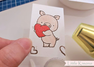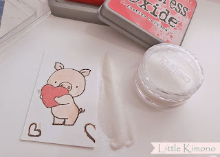 5. Podemos destacar elementos usando los polvos de emboss, ya los conoceréis pero si aún no lo sabéis son unos polvos finitos que se pueden usar de maravilla con las tintas DISTRESS, al ser de secado lento permite que los polvos se adhieran y luego usando una pistola de calor se "cristalizan" dando algo de relieve y brillo para destacar elementos, en este caso el corazón^^