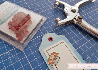 7. Colocamos todos los adornitos en su sitio con cinta doble cara, ponemos un eyelet y listo.
