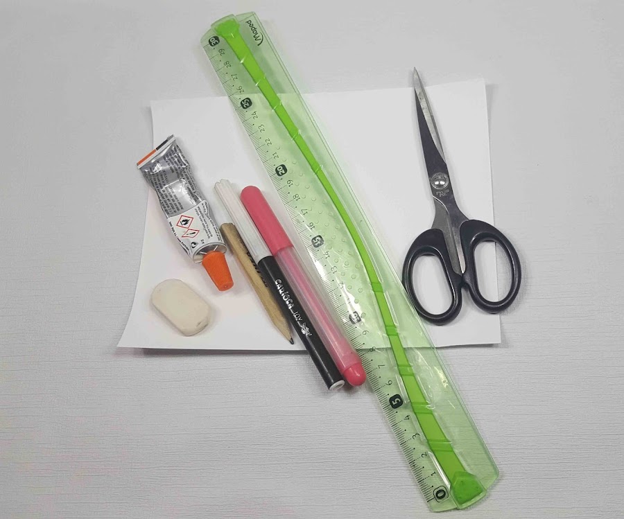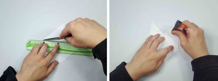 Pasamos las tijeras con la ayuda de la regla para hacerle unas dobleces a la cartulina. Aplicamos pegamento solamente en el triángulo derecho. Doblamos el triángulo izquierdo y después el derecho.