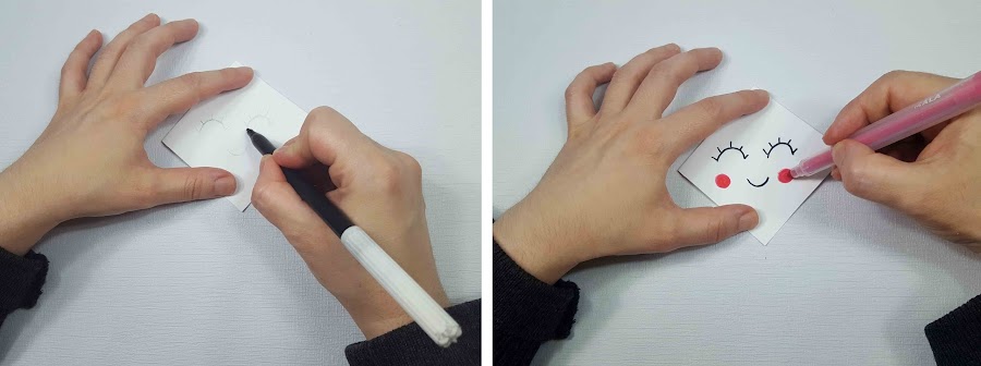 Dibujamos la carita primero con el lápiz y después con el rotulador negro para los coloretes el rotulador rosa.