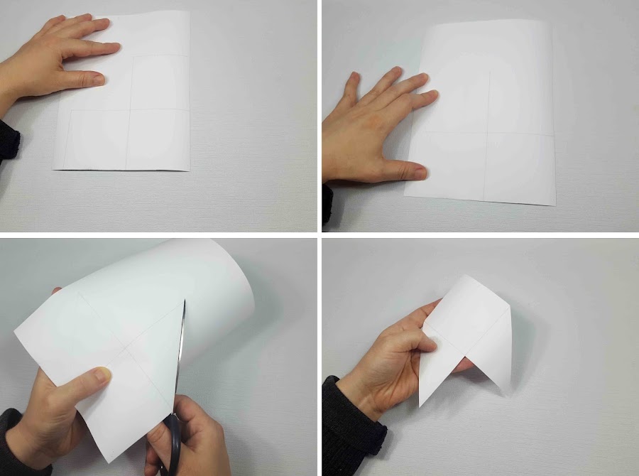 Hacemos tres cuadrados de 7 x 7 cm cada uno. Marcamos una raya en el cuadrado derecho y otra en el cuadrado izquierdo. Borramos dos líneas de los dos cuadrados y ahora recortamos el dibujo que ha quedado.