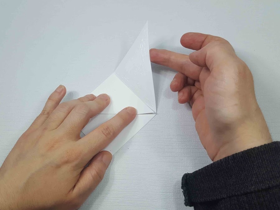Pasamos las tijeras con la ayuda de la regla para hacerle unas dobleces a la cartulina. Aplicamos pegamento solamente en el triángulo derecho. Doblamos el triángulo izquierdo y después el derecho.