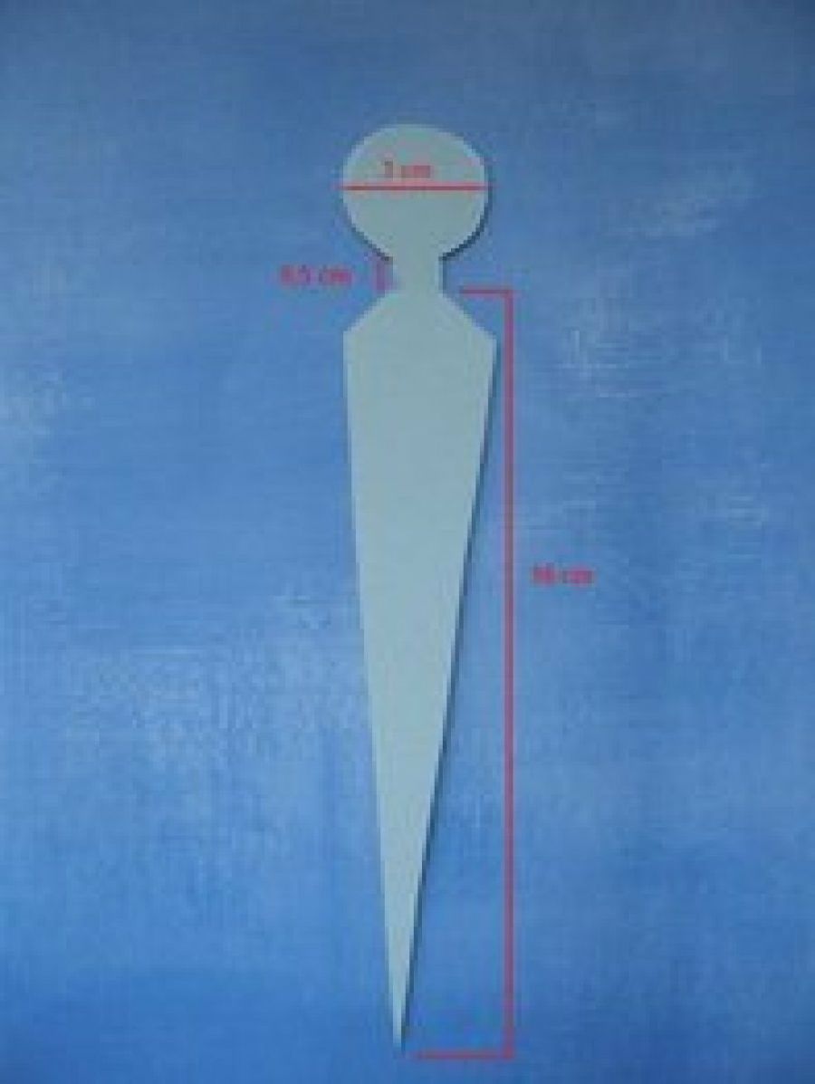 Lo primero es recortar la lámina de cartón que ha de ser de unos 20-21cm de altura y tendrá forma de ?puñal? tal y como se observa en la foto. La cabeza de la muñeca la puedes dibujar con un tapón de una botella grande de refresco. Ten cuidado al trazar el cuerpo y los hombros, pues la anchura de estos debe medir lo mismo que el diámetro de la cabeza. Hecha la base, se pasa a vestir a la muñeca de dentro a afuera.