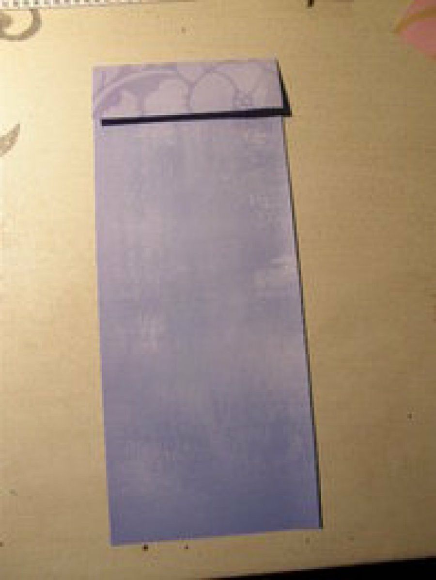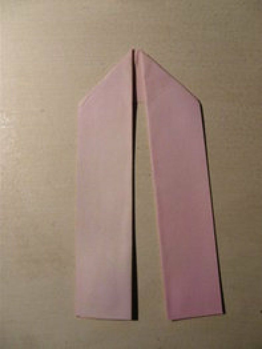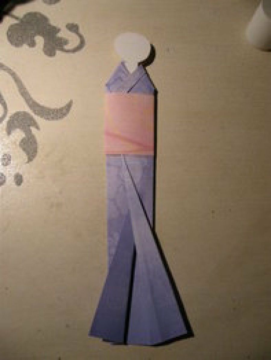 El vestido se hace con una sábana de papel de 25x9 cm aproximadamente, a la que haremos una solapa de 3 cm en la parte más estrecha. Ésta última se pliega hacia arriba por la mitad para crear el cuello del kimono.