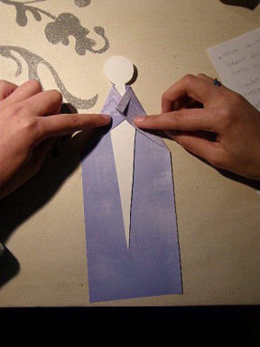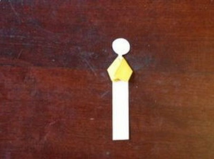 Hay que comenzar con el cuello. Recortar un rectángulo de 3x5 cm y doblarlo por la mitad a lo largo. Este trozo debe colocarse por detrás y se dobla alrededor como un chal. El lado izquierdo debe quedar por debajo del derecho y, una vez hecho, pega las puntas para que no se muevan. Los picos laterales se meten hacia adentro y así queda totalmente ajustado al tronco del marcador.