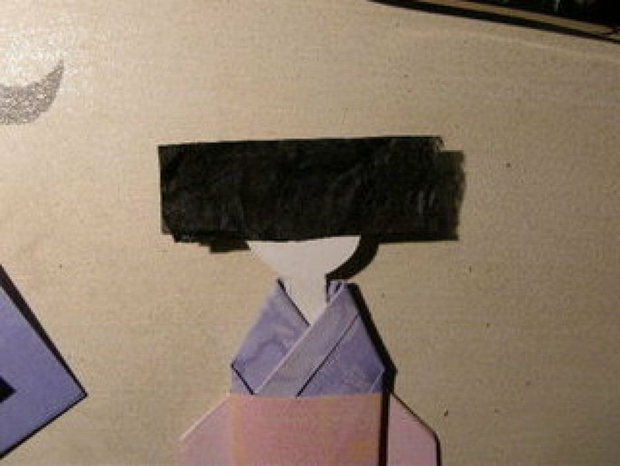 Por último, sólo te falta la cabeza de tu muñeca. Eleojota ha probado con un sencillo corte paje y un moño. De nuevo, ajusta una banda horizontal negra a la cabeza, sólo que esta vez lo haremos al revés para que las dobleces no se vean y el moño será un redondel negro hecho con el mismo papel y pegado por detrás.