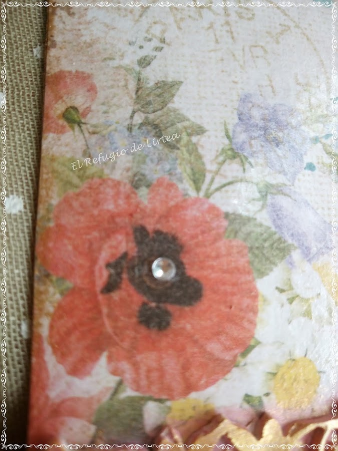 Una vez realizados el decoupage, doy una mano de barniz brillante y entinto todos los bordes para continuar con la decoración.