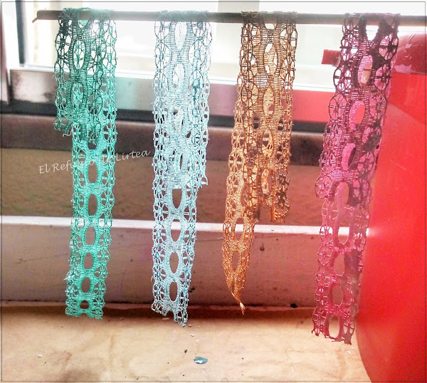 En un recipiente mezclo agua y pinturas acrílicas en distintos colores, sumerjo unos segundo los encaje y luego dejo secar y ya tengo mis encajes teñidos.