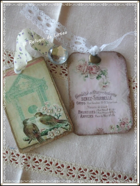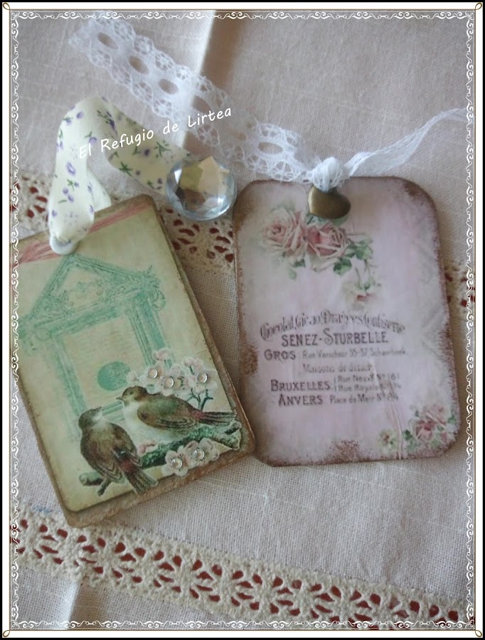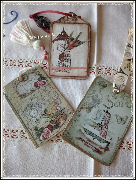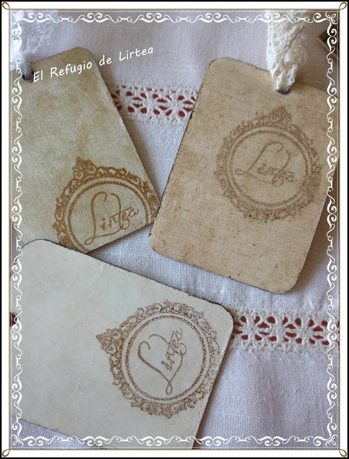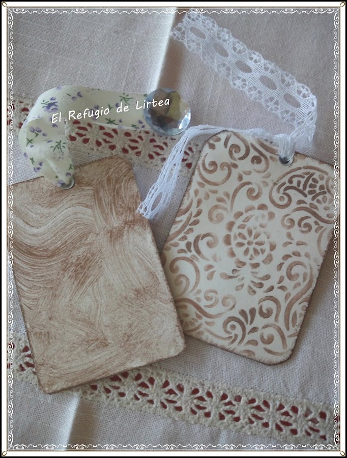 Llevan una arandela y un adorno, bien realizado con encaje, tira bordada o cordón de cuero, terminado con distintos elementos decorativos como un corazón de madera, un adorno de pedrería (reciclado de unos adornos de unos zapatos), pequeños charms o cordones de hilo con sus borlas.