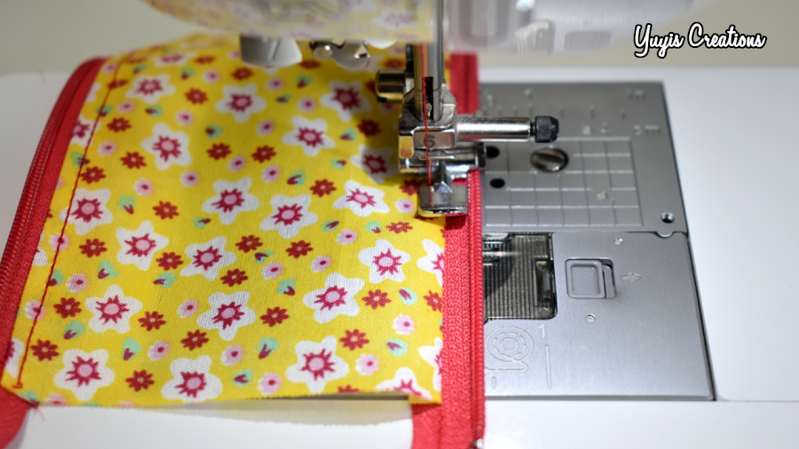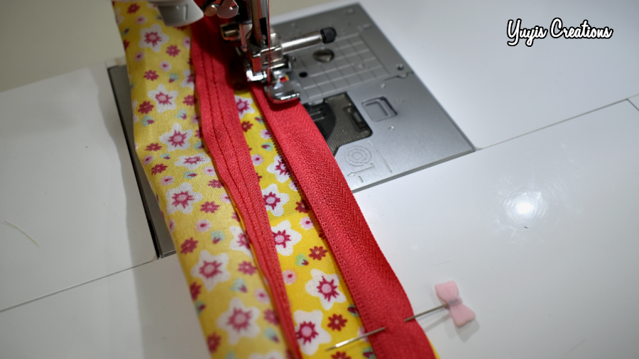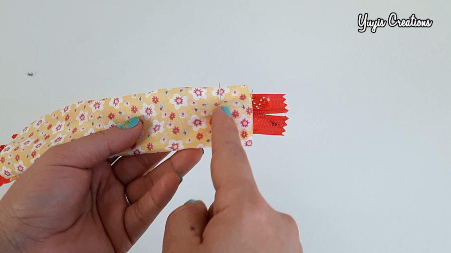 Ahora llevamos el otro extremo de la tela hacia el borde de la cremallera y cosemos.