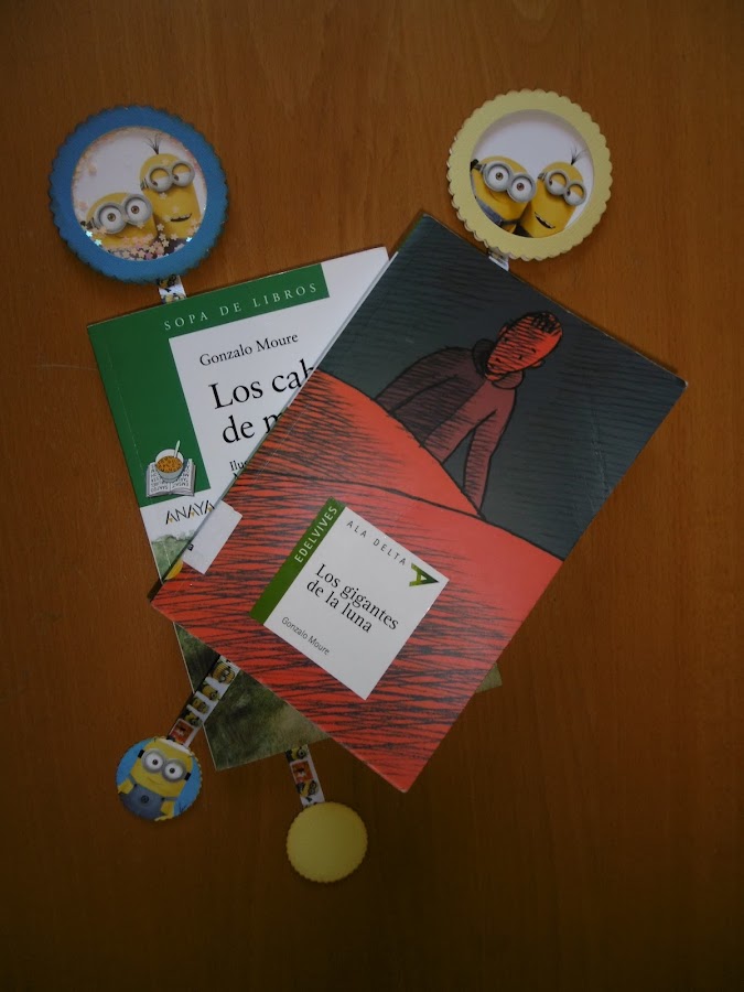He elegido unos Minions para hacer unos marcapáginas infantiles. He usado unas etiquetas de ropa para el motivo central, un papel con el dibujo que no se de donde salió...y una cinta Minions que compre en una feria. Uno de ellos , el azul, tiene "estrellitas flotantes" el otro solo el marco.
