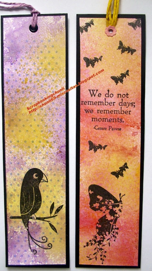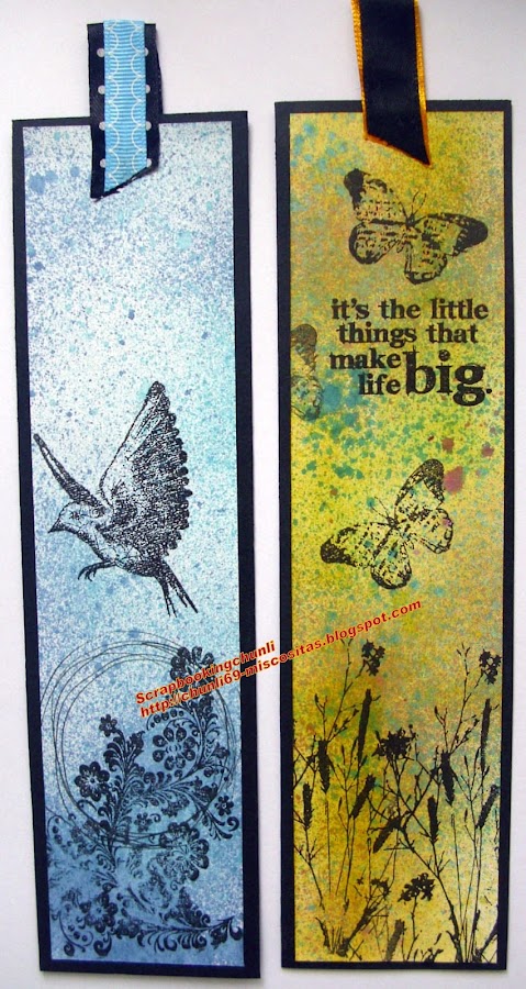 Hoy os voy a enseñar los marcapáginas que he hecho tanto esquineros como de los largos, para los largos básicamente he hecho fondos con los distintos glimmer que tengo y unas nuevas tintas que ha sacado aladine (no os pongo el nombre porque no me acuerdo).