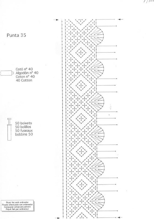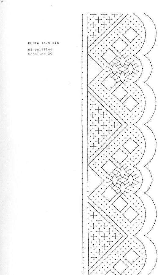 Puntilla IIIDe vez en cuando sabeis que me gusta poneros algo de bolillo, dichosas vosotras, que se os da bién, por que a mí, fatal, soy una negada, lo reconozco. Y mira que me encanta. A ver qué tal os quedan con éstos bonicos patrones de puntillicas onduladas.