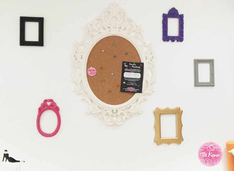 Y ya tenemos listo nuestro nuevo corcho para colgarlo en la pared. Con la ayuda de Rafa lo colgamos en el taller y para que quedara una pared más completa, colgamos alrededor unos cuantos marcos más pequeños vacíos. Pero para darles un toque más alegre, los pintamos de colores y para ello, utilizamos la pintura en Spray Pintyplus, de novasol que ya sabéis que nos gusta mucho por los colores tan brillantes que tienen.