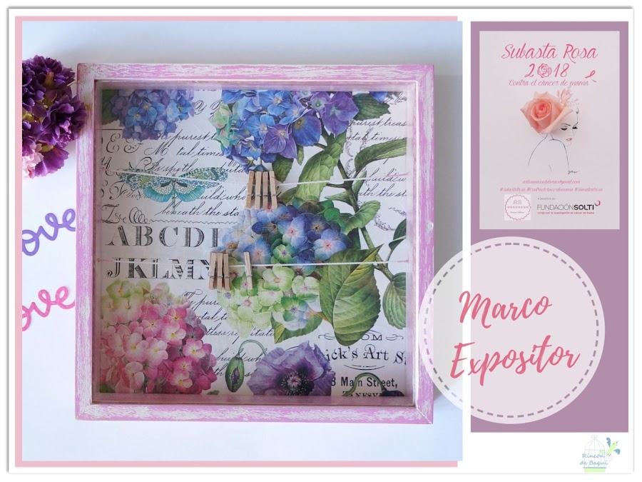 En mi caso aporto este Marco Expositor, decapado en rosa y fondo decorado con papel de arroz. Las medidas son de 23 x 23 cm.