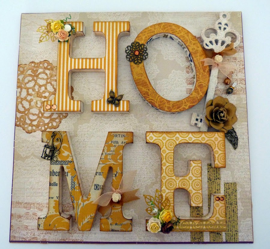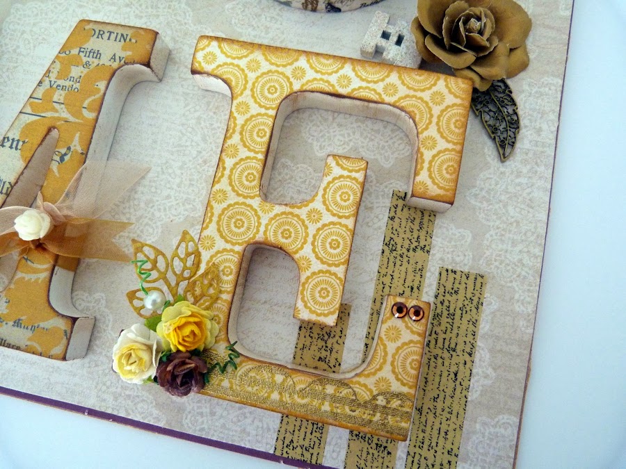 Las letras son compradas en un bazar, lijadas, forradas con papel y entintadas con distres un poco a manchones para darle un aspecto desgastado.