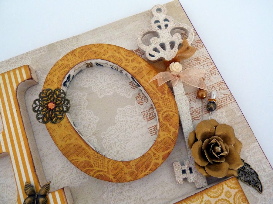 Alrededor de la O le puse washi tape. La llave es un adorno navideño que compré en Casa, tenía un blanco nuclear que "maté" con distress para dejarla a tono con el resto de colores.