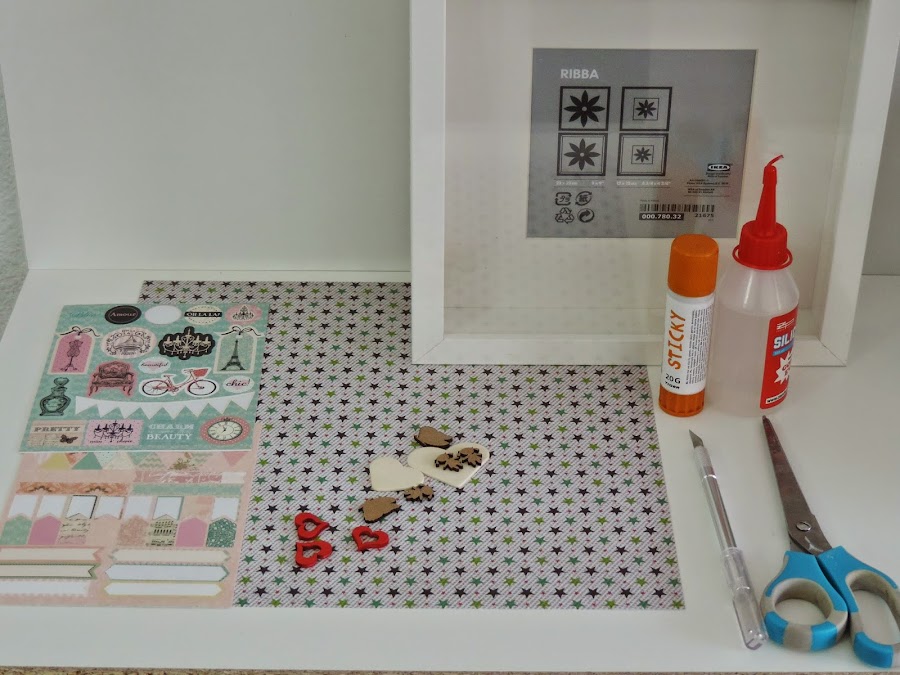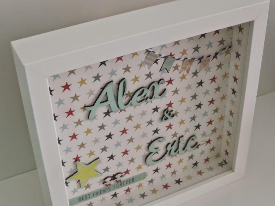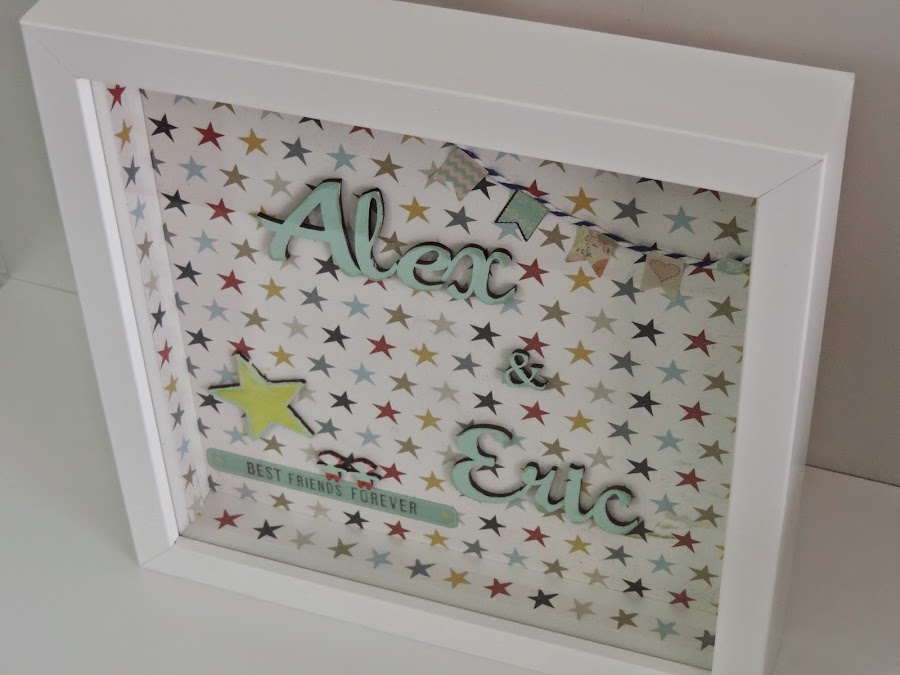 Ponemos la trasera con el dibujo mirando hacia nosotros y planteamos antes de pegar como vamos a querer que sea y lo que queramos que lleve ( aqui es donde entra la imaginación) si vais a poner letras y aplicaciones de madera mejor pintar antes de pegar .....pintamos dejamos secar y pegamos , volvemos a cerrar el marco y ....listo!!!!