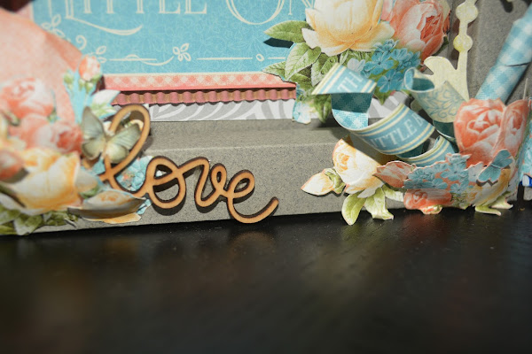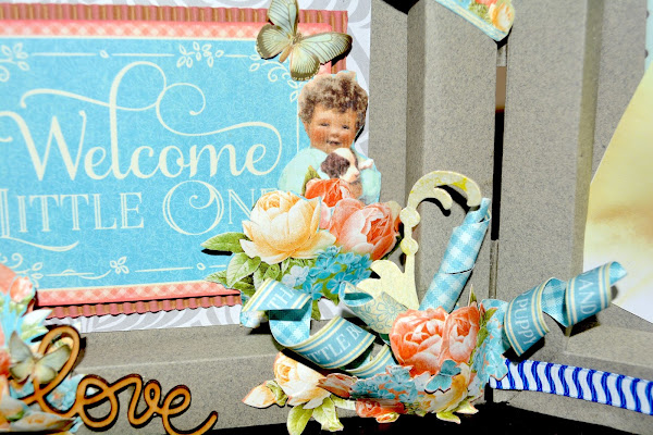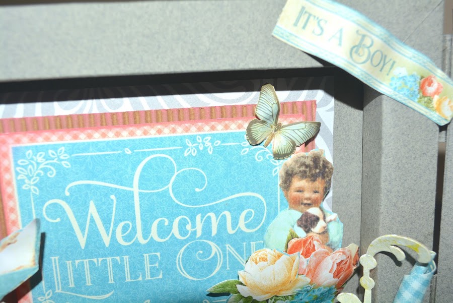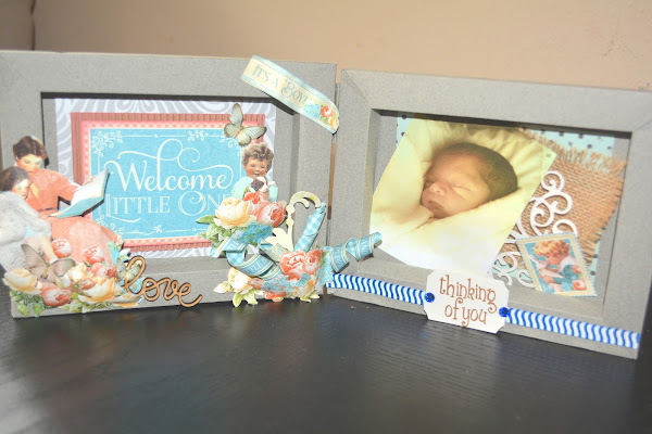 Cómo puedes ver lo he decorado con pequeños trozos de papel de Graphic 45 de la colección Precius memories, que me pareció bastante "aprovechable" cada imagen para recortar y darle volumen al marco y así envolver de bonitos detalles la fotografía de Mateo.