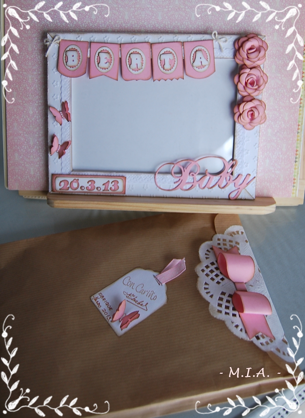 Forrado con cartulina embosada con carpetilla con la Big Shot y entintado con tinta Distress Walnut Stain y encaje blanco por el borde interior. Lo he adornado con un troquel de Marianne CREATABLES Die Cutting Embossing Stencil ELINE"S BABY TEXT_PIN en rosa muy suave pegado varias veces para simular un chip board. Unos barners en la parte superior derecha con unos scalop resaltan las letras del nombre y van montados sobre un cordón con lazadas en los extremos. A la izquierda tres rosas caseras envejecidas con walnut stain y a la derecha dos mapisosas montadas dobles y con el cuerpo de mini perlitas.