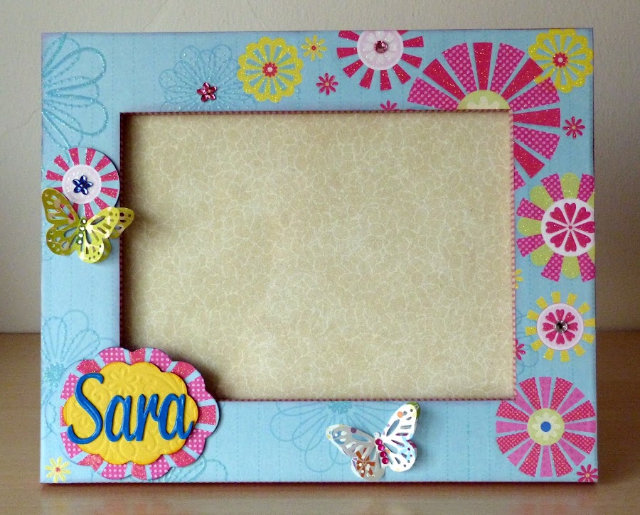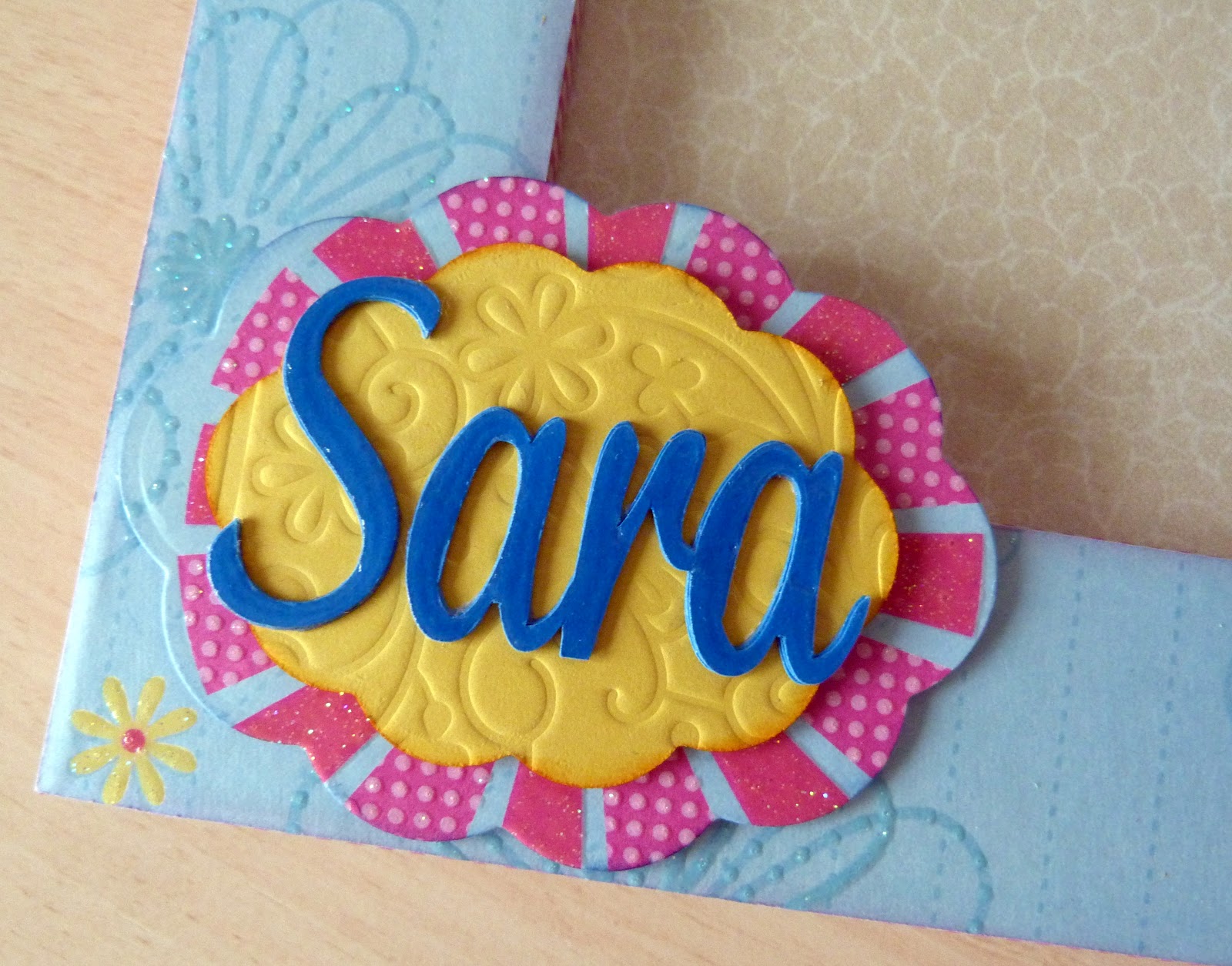 El nombre, cortado con la Craft Robo cuatro veces para darle el aspecto de chipboard, está montado sobre doble capa de Spellbinders Scalloped Ovals.