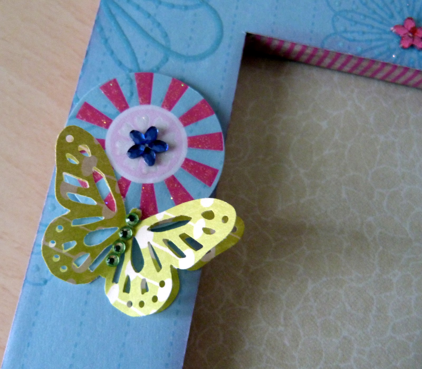 El recorte es del mismo papel, pegado con cinta 3D y con una abalorio de flor en el centro.