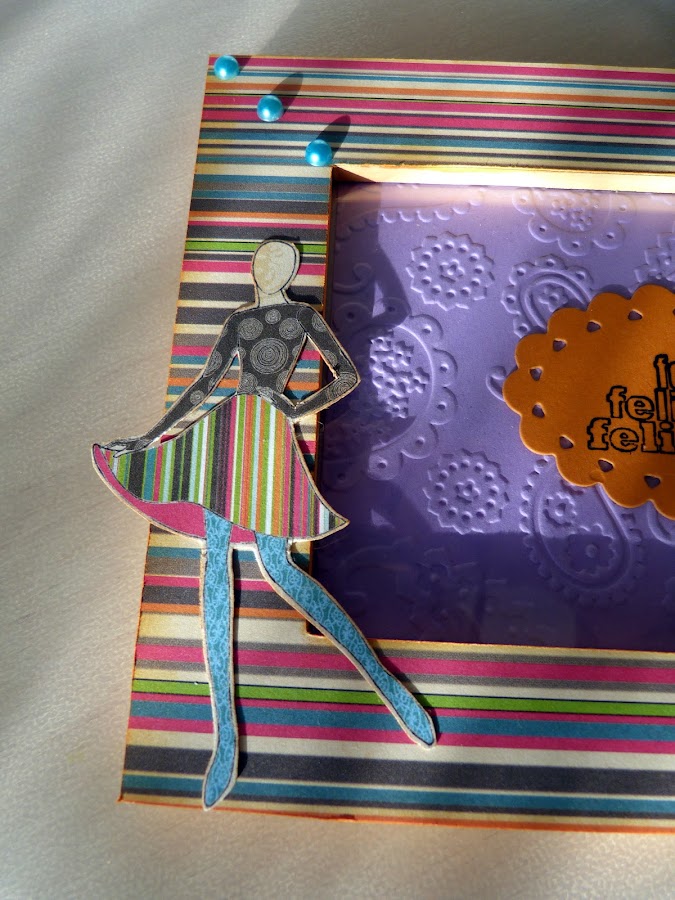 En el lugar donde va la fotografía puse cartulina embosada con un troquel regalo de Montse con el mensaje de "moltes felicitats" que es un sello de Blokum.