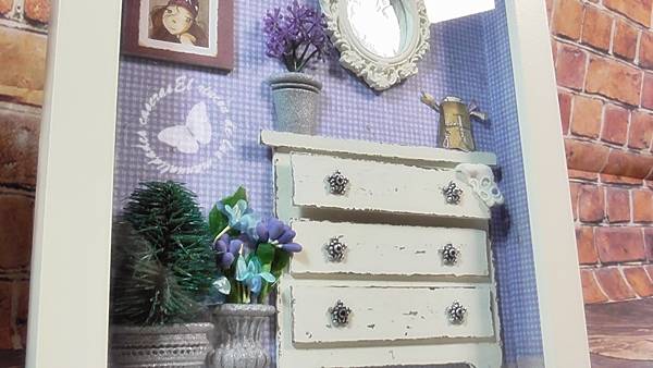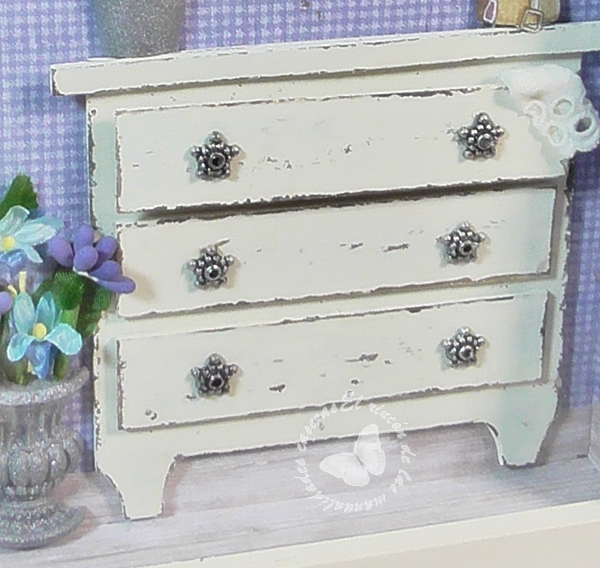 La cómoda esta hecha con cartón contracolado o gris y los tiradores son piezas de bisuteria.