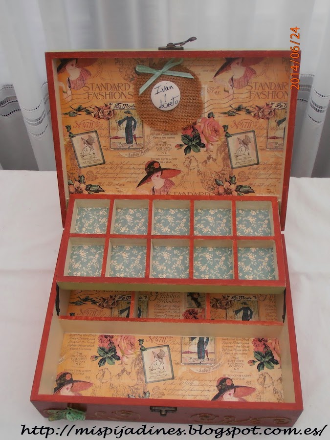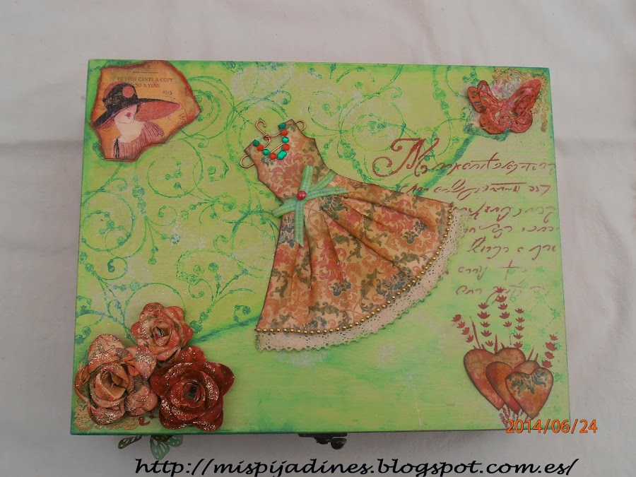 Me gusta mucho el scrap y en las cajas siempre meto alguna cosa, tal como el detalle del vestido o las rosas que las hago yo...corazones..etc