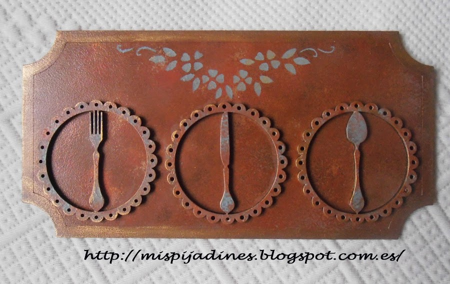 Un cuadrito para la cocina , es un soporte de DM y los cubiertos los compre en la feria de Bilbao, quise darle un aire envejecido y oxidado...