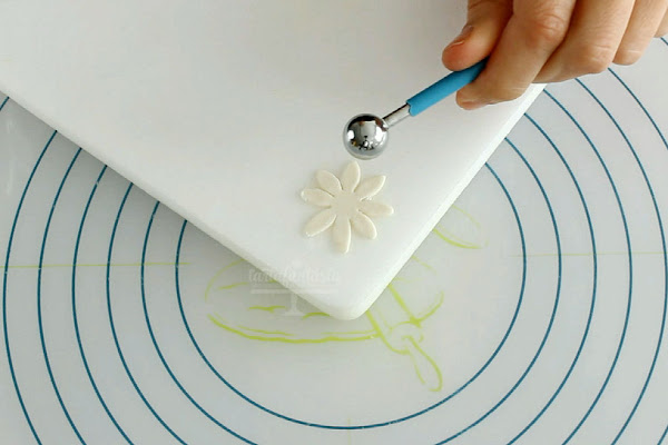 Haremos un agujero en cada hueco de la cubitera para poder introducir el alambre de la flor, la flor quedará abierta en su justa medida y además podéis encontrar cubiteras de varios tamaños por si preferís hacer las margaritas más grandes. Una vez agujerada ponedla sobre una rejilla, de las que usamos para enfriar la repostería, y para que el alambre quede colgando apoyaremos la rejilla sobre algo relativamente alto, yo utilizo los propios envases de la pasta de goma. Os invito que veáis el vídeo, creo que lo entenderéis mejor...