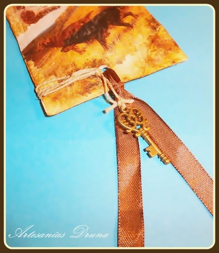 Este cuelganotas es totalmente original para la cocina. Está realizado con papel de scrap, tintas Disstres y diversos adornos de poliresina y tela. Precio: 10 €