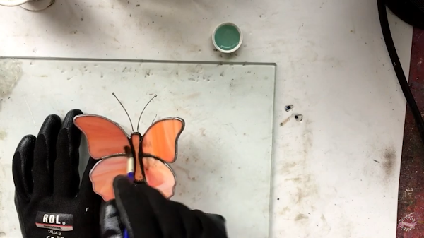 Con toda la pieza armada solo falta aplicar la parina, en este caso use de color negro, la aplicamos por todos los lados plateados de la mariposa, lo hacemos con pincel o un cepillo, listo esto lavamos la pieza rápidamente la secamos y limpiamos el vidrio con alcohol para devolver su brillo y así hemos terminado con esta linda y decorativa manualidad.