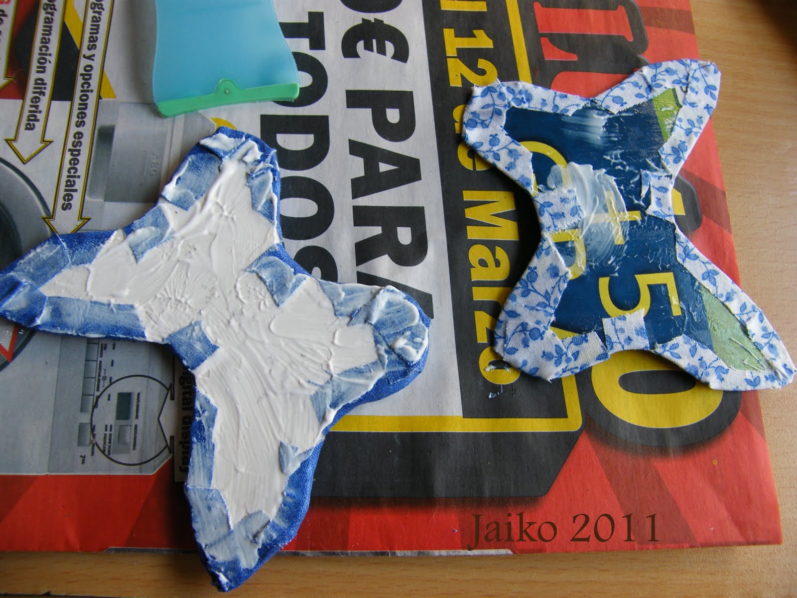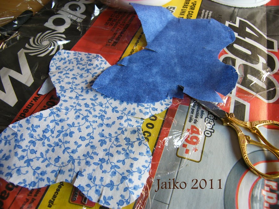 Estas mismas piezas las pasamos a tela y las dibujamos por el revés, a continuación recortamos dejando un margen de medio cm. Yo he elegido 2 telas contrastadas, pero eso ya ..al gusto.