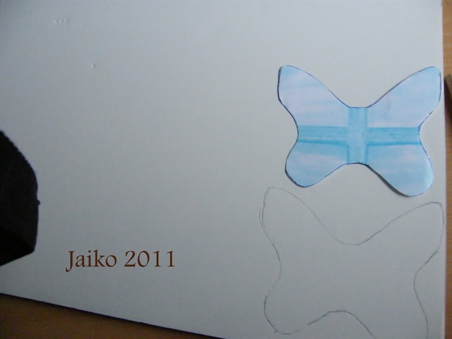 de la red guardé la imagen de la mariposa, hay muchas formas, pero yo me decanté por esta porque es la más sencilla, una vez recortada la transferí a cartón pluma y con un cúter de precisión la recorté.