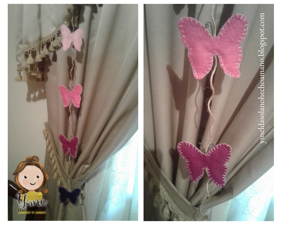 5.- Y ya terminadas mis mariposas, sólo era cuestión de colocarlas decorando las cortinas.