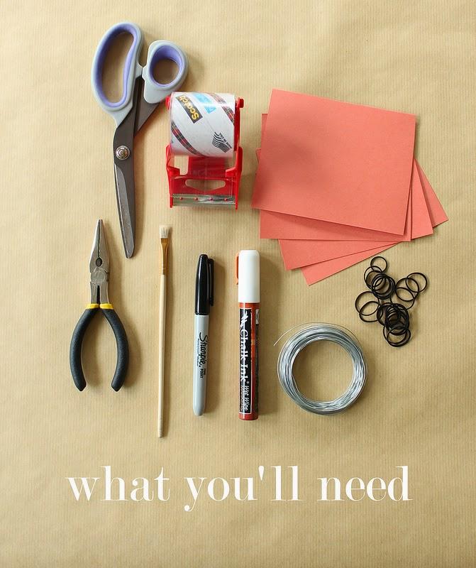 Materiales: Necesitará cartulina algo gruesa, alambre de calibre 24, gomas de caucho de silicona, alicates de punta de aguja, tijeras, cinta adhesiva, un pincel, un rotulador negro, y un rotulador de punta fina de tinta blanca.