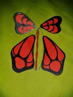 El cuerpo para hacerlo más natural,(como en el caso de la libélula), lo podemos hacer con un material que no pese y así tapamos "el motor " de vuelo de nuestra mariposa,como puede ser un palillo de dientes recubierto de lana,eso por encima de su contorno generalmente de alambre,etc...Cuando haga mi mariposa la pondré en el blog,así como intentaré hacer un pájaro,con el mismo método de propulsión.En los siguientes apartados,se puede ver más o menos el mecanismo de estas "mariposas o pájaros mágicos".