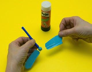 Ya solo nos queda pegar las alas con un poco de celo y girarlas para retorcer la goma, cuanto mas se retuerza mas volará.