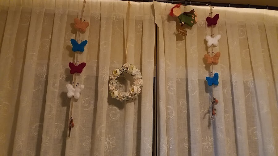 Las he puesto en la cortina de mi salita de estar, junto a la corona de flores que hice, y un angelito de madera, que me trajo mi hermana de Alemania.