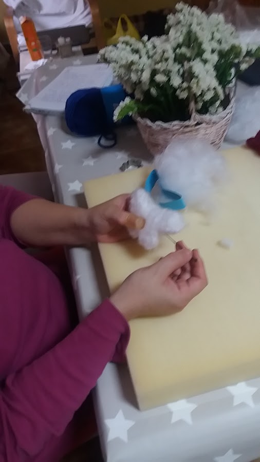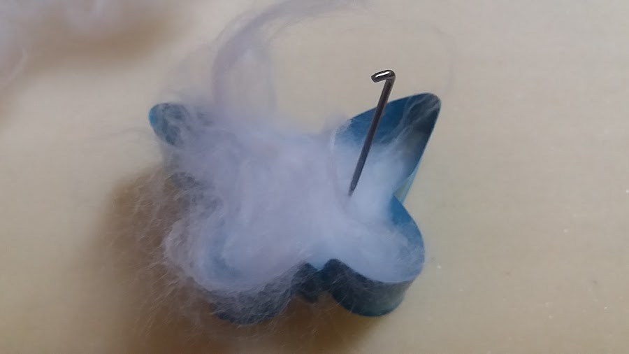 Ponemos un poquito de lana afieltrada en el interior del molde, y con la aguja devanera, vamos pinchando para que la lana se entre mezcle y consigamos una figura compacta.