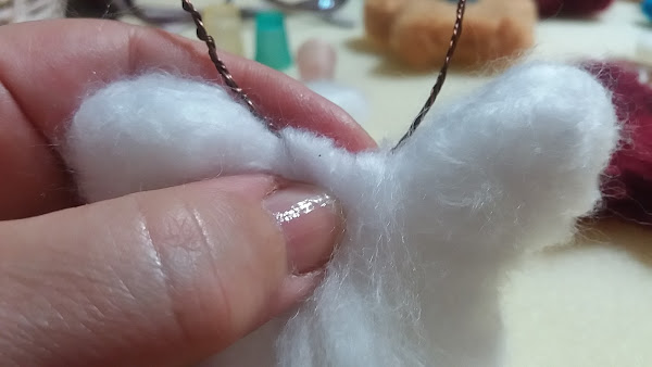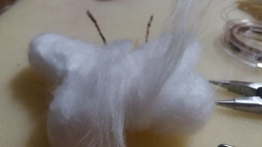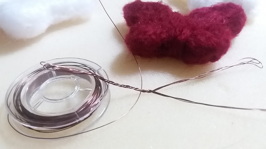 Con este alambre hice las antenas, las fui enrollando en si mismas. Luego hice las antenas. Como veis cojí varias hebras de alambre, este era demasiado fino, pero me gusta mas como quedaron las antenas de las mariposas. Eso ya va en gustos.