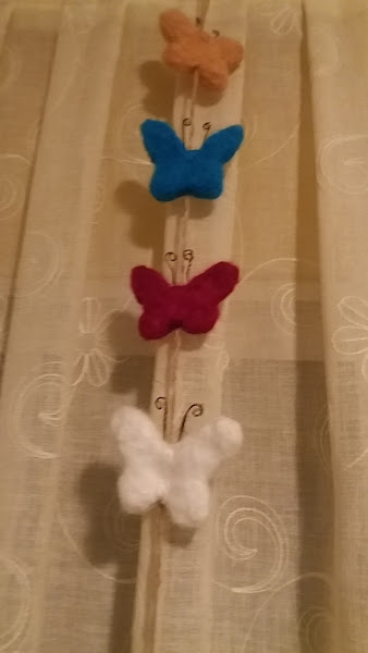 Hola Chicas, como vais?? hoy hace un tiempo maravilloso, he salido a pasear con Nilo y veíamos todo el campo llenito de flores silvestres, que me encantan, y el como siempre persiguiendo algún insecto volador, me hace mucha gracia verlo ... , pues mi propuesta para este viernes handmade de Jen y para el Finde Frugal de Marcela, son unas mariposas hechas con lana afieltrada.