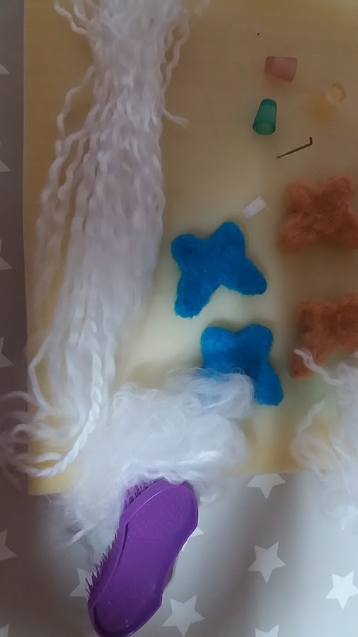 Como dicen una imagen vale mas que mil palabras, veis como se afieltra la lana, super fácil, vais cogiendo cabos, cortáis unos 15 cm, y separais las hebras, una vez separadas, las peináis con un cepillo duro, este que veis, es de plástico, y cuesta mas trabajo, pero tengo otro de esos de madera con las cerdas de plástico muy duras. Ese es muchísimo mejor.