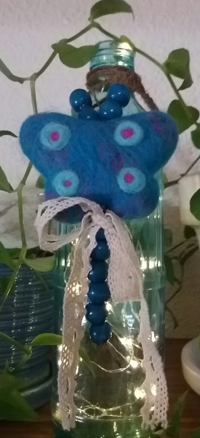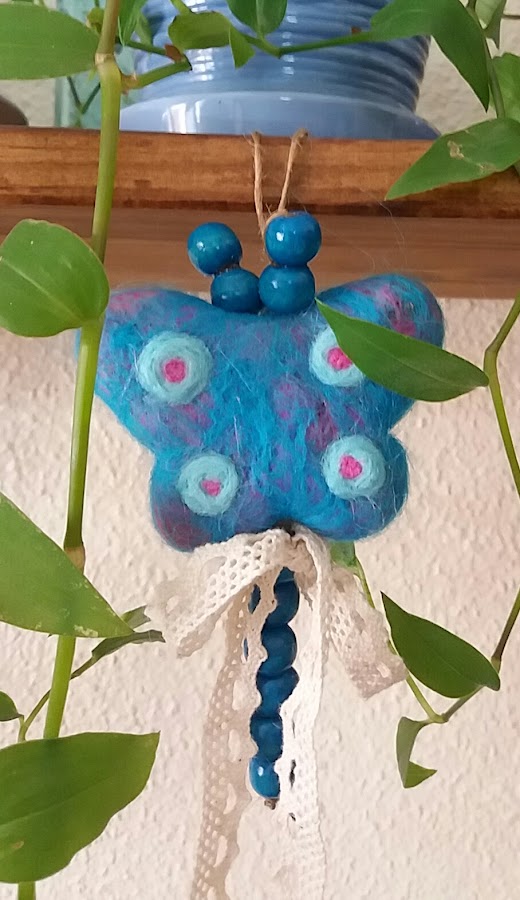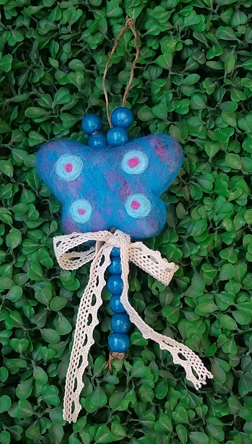 Mi Mariposa, para seguir con las tradiciones, es de lana afieltrada , realizada en dos colores predominantes: azul y rosa.